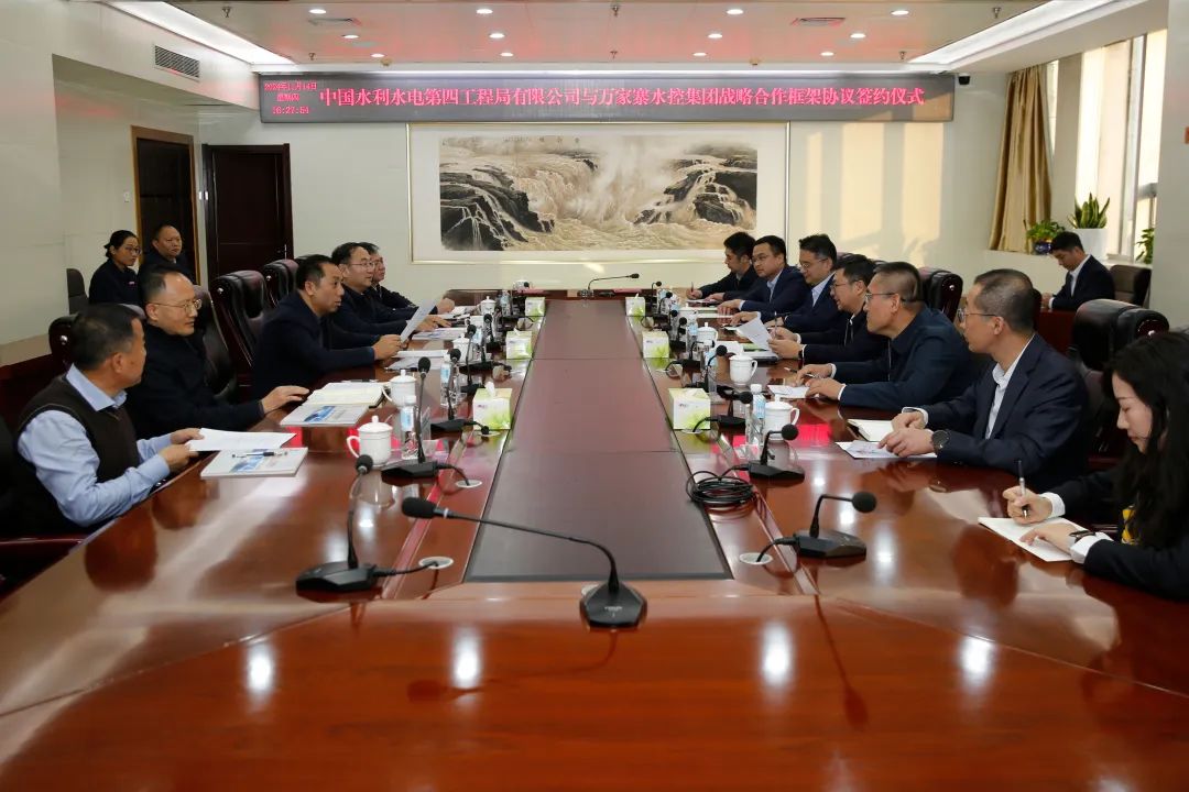 11月14日,萬家寨水控集團黨委書記、董事長、總經理蘭康杰與中國水利水電第四工程局有限公司(以下簡稱:中國水電四局)黨委書記、董事長、總經理龐旭舉行工作會談并簽署戰略合作框架協議。雙方將本著優勢互補、互惠互利、合作共贏的原則,構建起長期戰略合作關系。集團公司總工程師郝志亮,雙方相關部室、單位負責人參加會談和簽約儀式。
