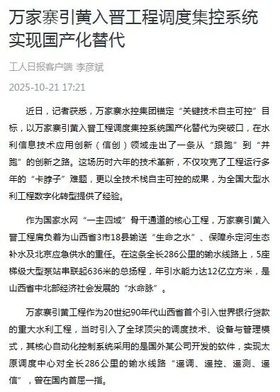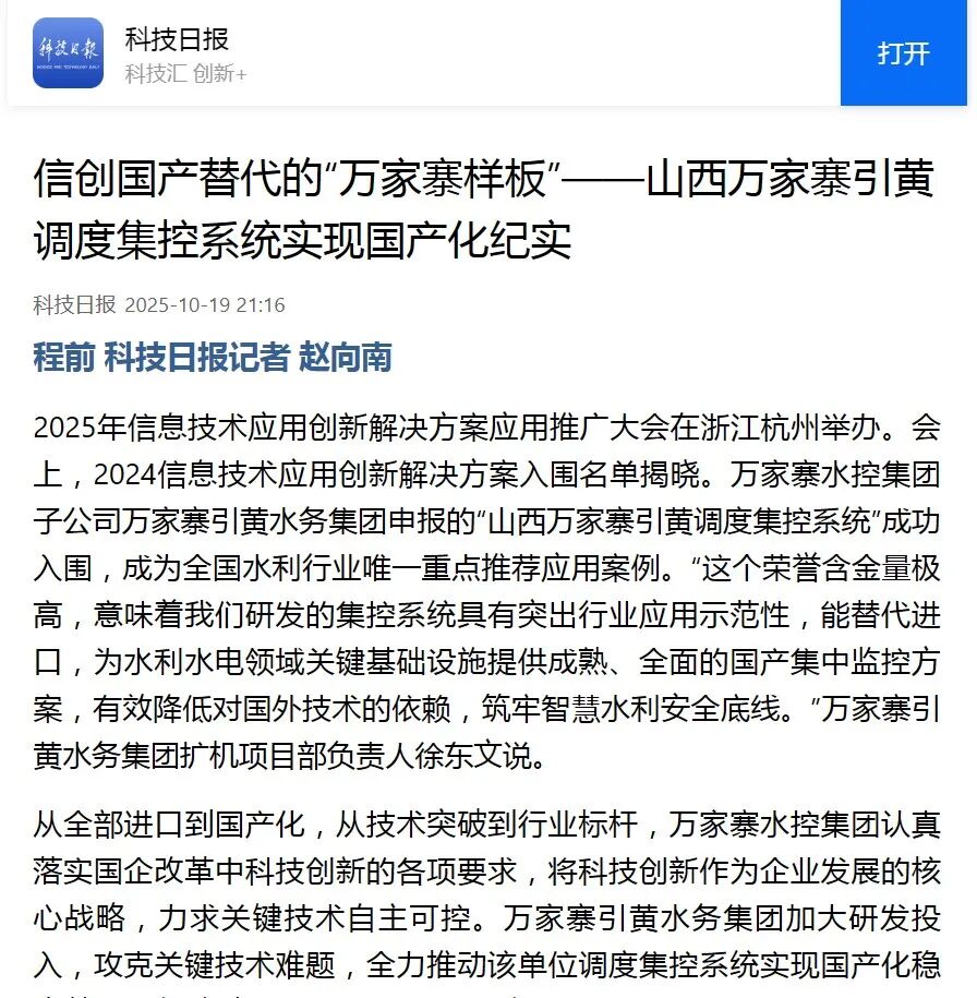 2025年信息技術(shù)應(yīng)用創(chuàng)新解決方案應(yīng)用推廣大會在浙江杭州舉辦。會上,2024信息技術(shù)應(yīng)用創(chuàng)新解決方案入圍名單揭曉。萬家寨水控集團子公司萬家寨引黃水務(wù)集團申報的“山西萬家寨引黃調(diào)度集控系統(tǒng)”成功入圍,成為全國水利行業(yè)唯一重點推薦應(yīng)用案例。“這個榮譽含金量極高,意味著我們研發(fā)的集控系統(tǒng)具有突出行業(yè)應(yīng)用示范性,能替代進口,為水利水電領(lǐng)域關(guān)鍵基礎(chǔ)設(shè)施提供成熟、全面的國產(chǎn)集中監(jiān)控方案,有效降低對國外技術(shù)的依賴,筑牢智慧水利安全底線。”萬家寨引黃水務(wù)集團擴機項目部負責(zé)人徐東文說。