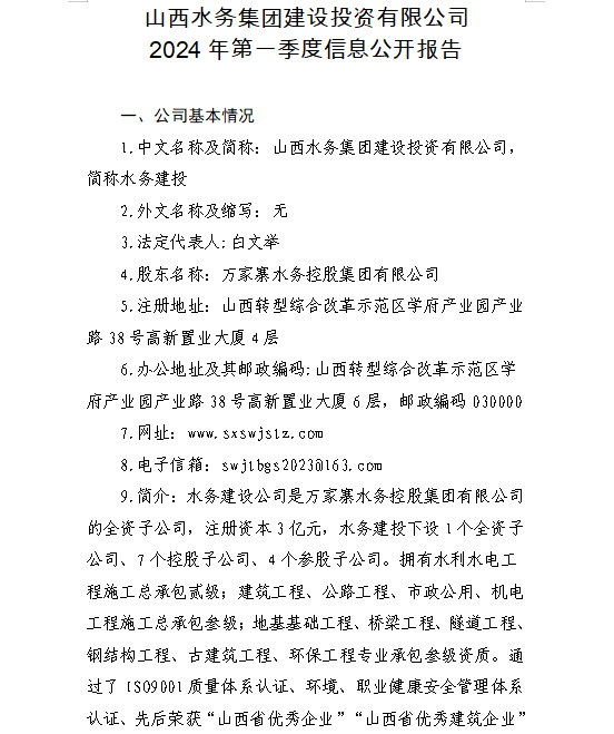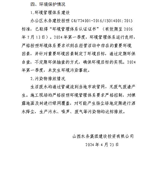 山西水投汾景水務有限公司2024年第一季度信息公開...